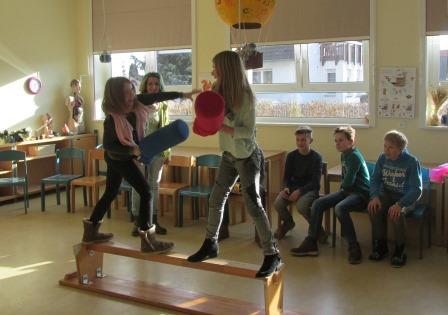 Die Themen Wut, Enttäuschung, Gewalt wurden mit den Schülerinnen und Schülern sportlich und spielerisch behandelt. Dazu hat unser Hortteam verschiedene Stationen vorbereitet. Verteilt über das gesamte Schulgelände konnten die Kinder zum Beispiel "Blindes Vertrauen" üben, indem sie sich von ihren Mitschülern mit verbundenden Augen über eine aufgebaute Hindernisstrecke oder einen Barfußpfad aus Tannennadeln oder -zapfen, Eiswasser, Stroh oder Glibbergelee führen ließen.