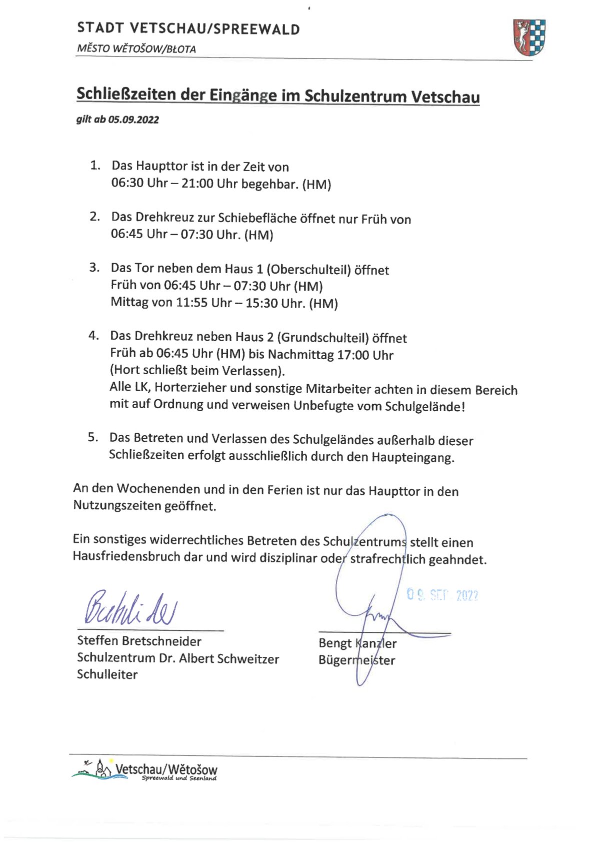Schließzeiten der Eingänge im Schulzentrum Vetschau